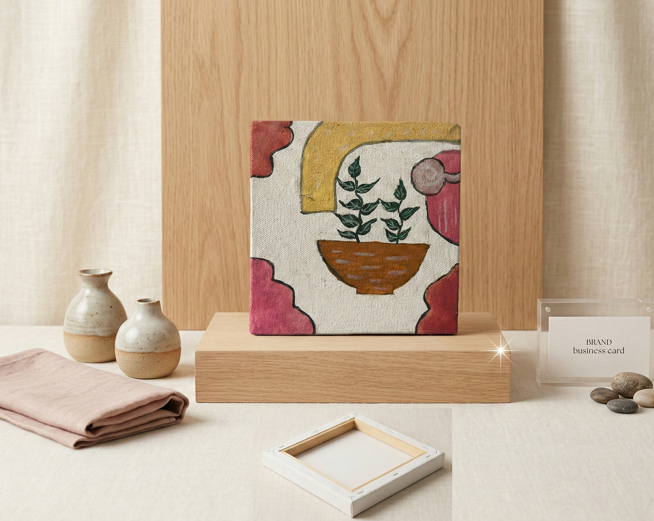 হস্তশিল্পিত মিনি ক্যানভাস আর্ট – "মাটির টবে সবুজ প্রাণ"
