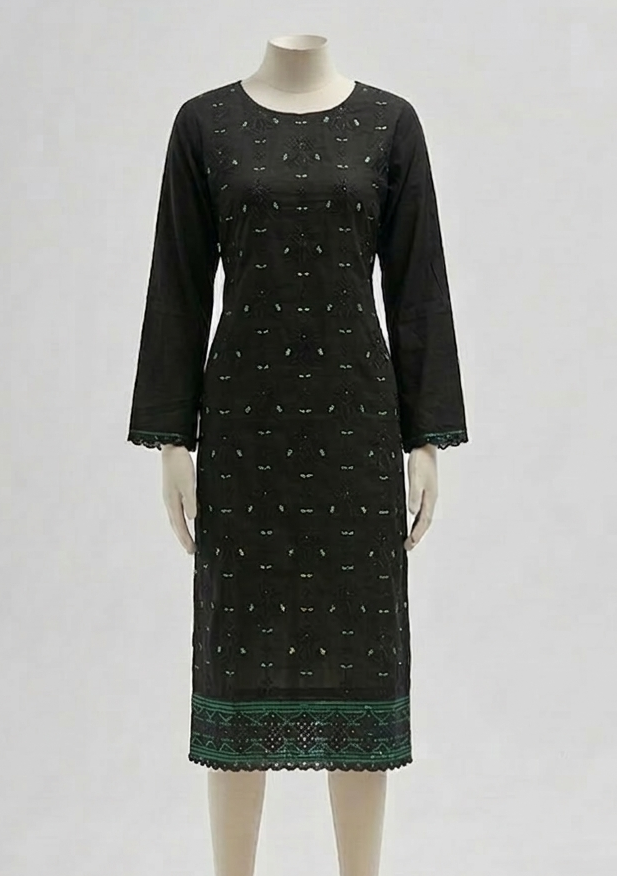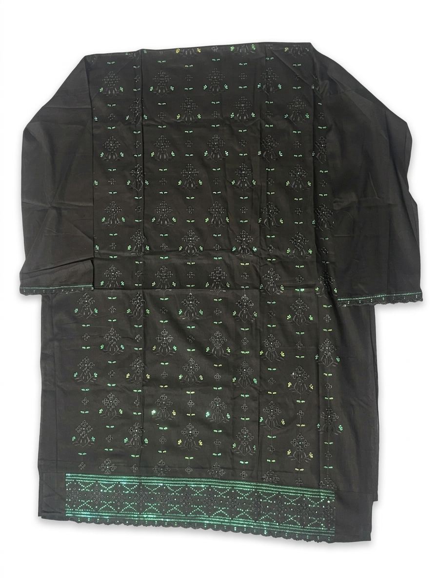 এইসুন্দরকালোএমব্রয়ডারিকরা৩ পিসটিআপনারদৈনন্দিনস্টাইলকেআরওআকর্ষণীয়করেতুলবে।পুরোজামাজুড়েরয়েছেছোটছোটনকশাএবংনিচেরদিকেরয়েছেদৃষ্টিনন্দনসবুজএমব্রয়ডারিবর্ডার, যাপোশাকটিকেআরওস্টাইলিশকরেতোলে।