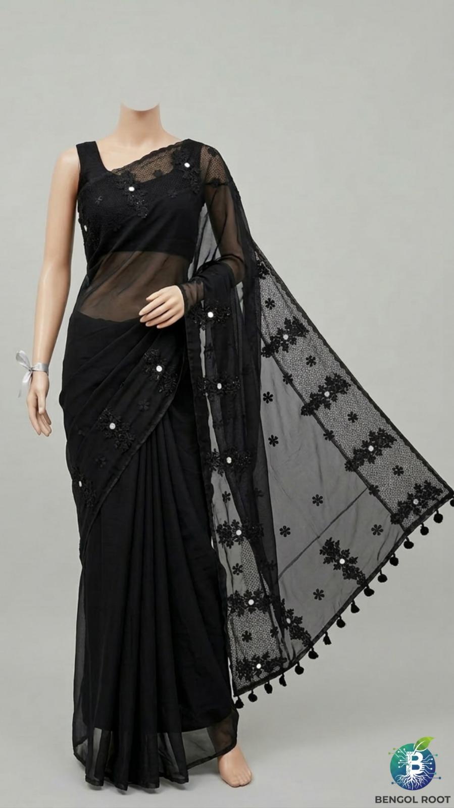 এলিগ্যান্ট কালো হাফ সিল্ক এমব্রয়ডারি শাড়ি (ফুলেল ডিজাইনসহ)