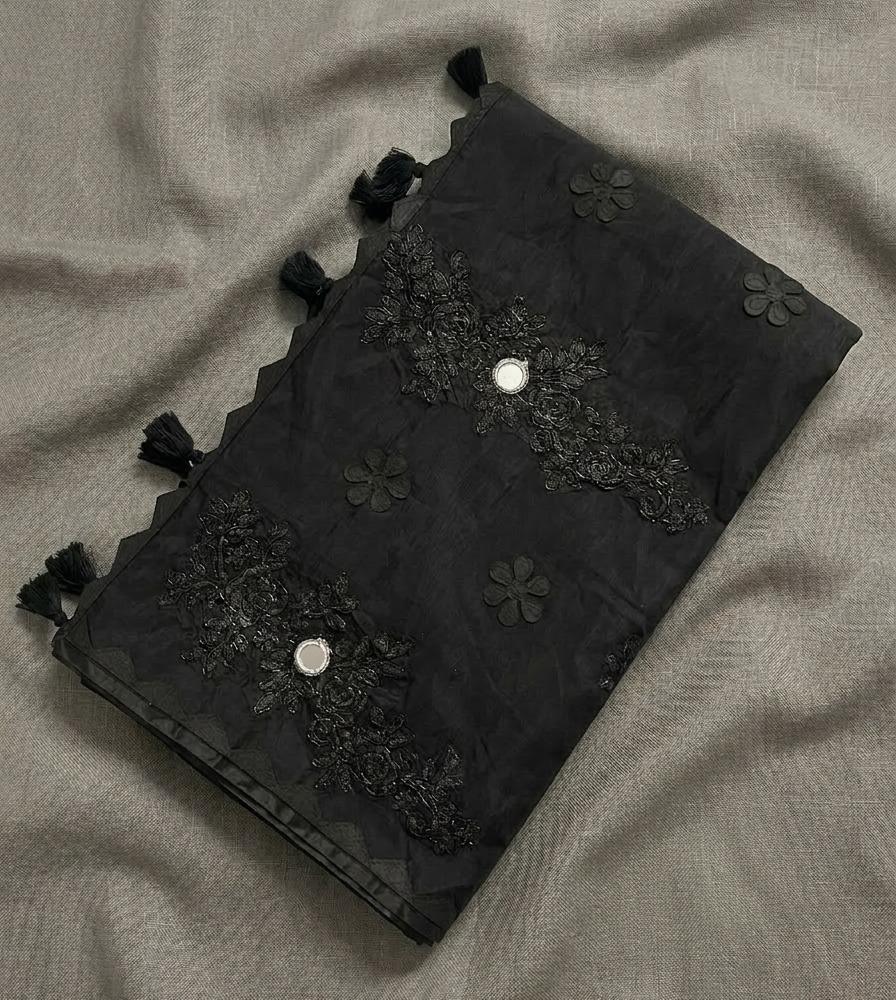 এই দৃষ্টিনন্দন কালো হাফ সিল্ক শাড়িটি আপনার স্টাইলকে দেবে এক অনন্য ও এলিগ্যান্ট লুক। হালকা ও স্বচ্ছ কাপড়ে তৈরি এই শাড়িতে রয়েছে সূক্ষ্ম ফুলেল এমব্রয়ডারি এবং ছোট ছোট মুক্তোর মতো ডিটেইলিং, যা পুরো ডিজাইনকে করেছে আরও আকর্ষণীয়।